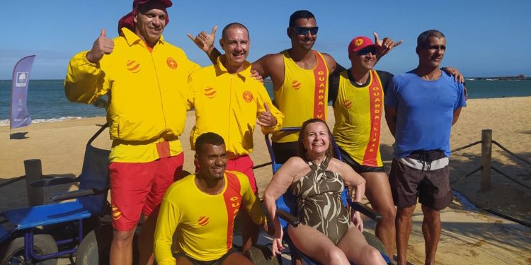 O banho de mar assistido para pessoas com deficiência é realizado com toda segurança por uma equipe de guarda-vidas, proporcionando momentos de lazer e alegria.